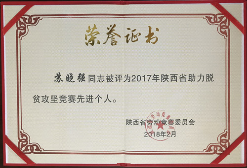 ? ? 在2018年初陜西省勞動(dòng)競(jìng)賽委員會(huì)開展的助力脫貧攻堅(jiān)競(jìng)賽中,蘇曉強(qiáng)同志被授予“陜西省助力脫貧攻堅(jiān)競(jìng)賽先進(jìn)個(gè)人”榮譽(yù)稱號(hào)。