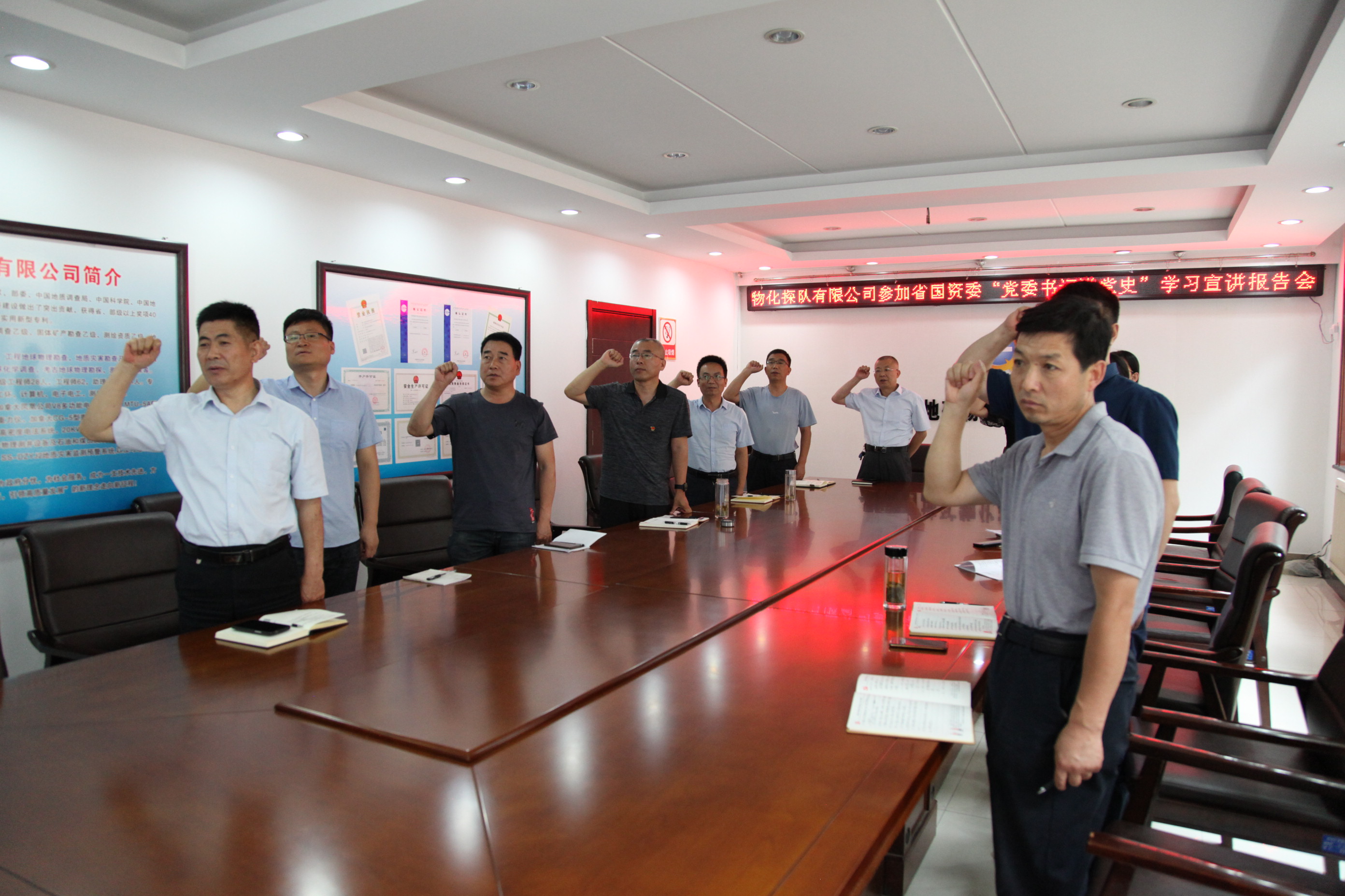 ? ? 6月23日上午,物化探隊有限公司班子成員和支部書記參加了省國資委系統“黨委書記講百年黨史”系列黨課宣講報告會(第十講)。省國資委黨委書記、黨史學習教育領導小組組長劉斌以《扛起國有企業時代責任 致敬中國共產黨成立100周年》為題,為系統黨員干部“黨委書記講百年黨史”系列黨課活動畫上了圓滿句號。報告會以視頻會形式在二樓會議室召開。